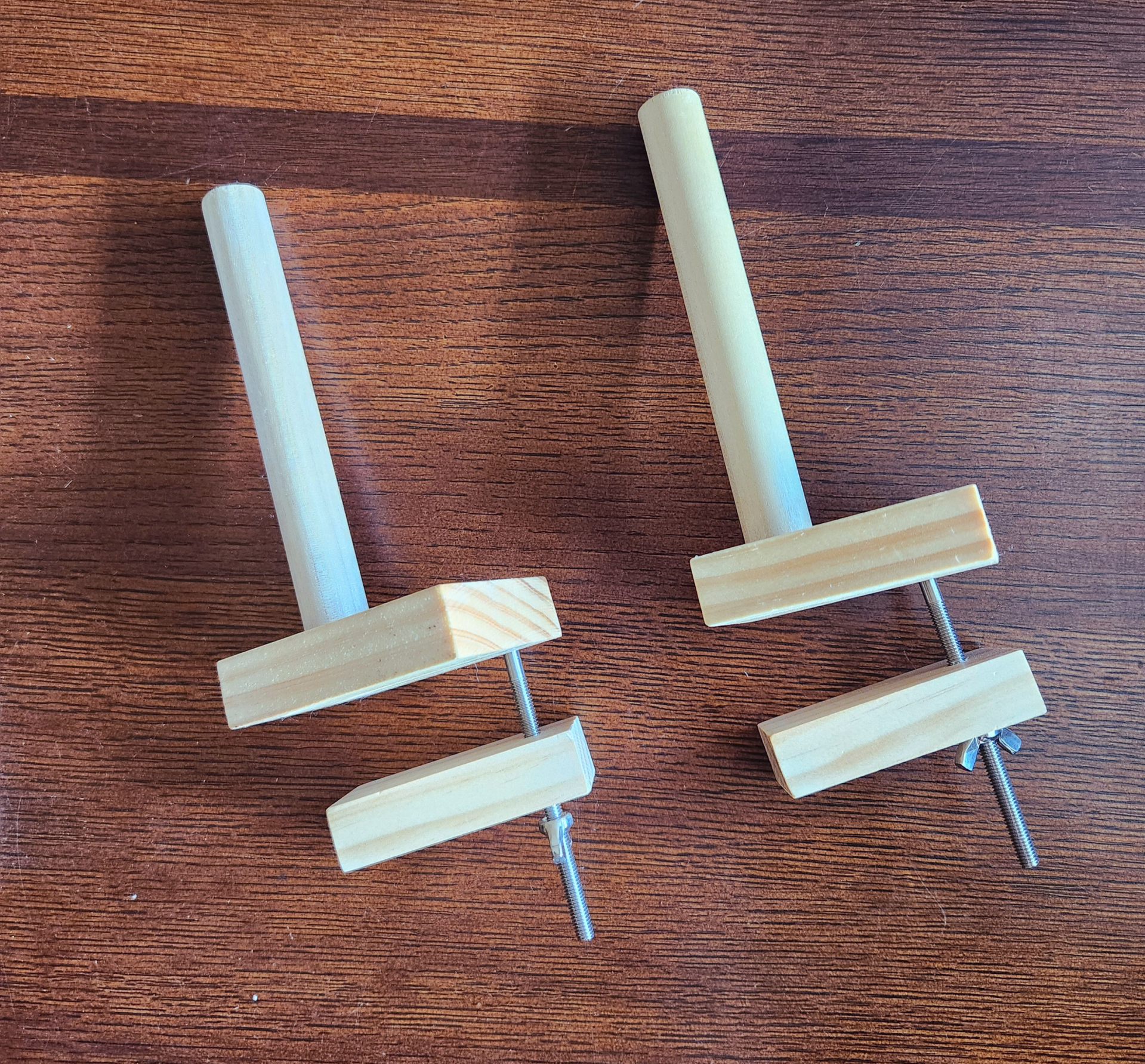 The warp clamps are a set of wooden clamps that mount to a table to set up the long warp strands of the band.